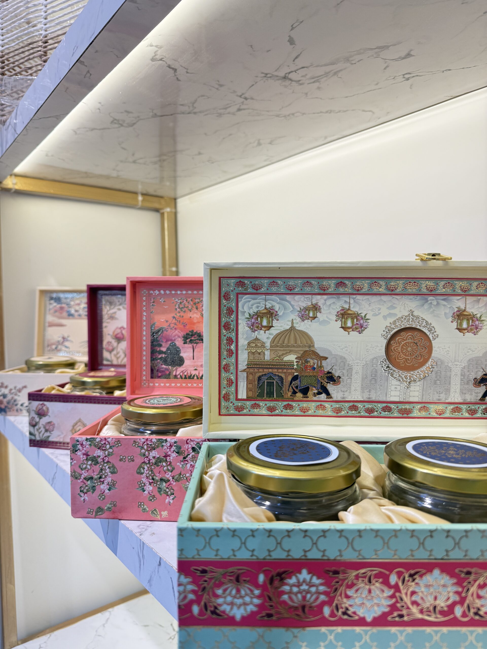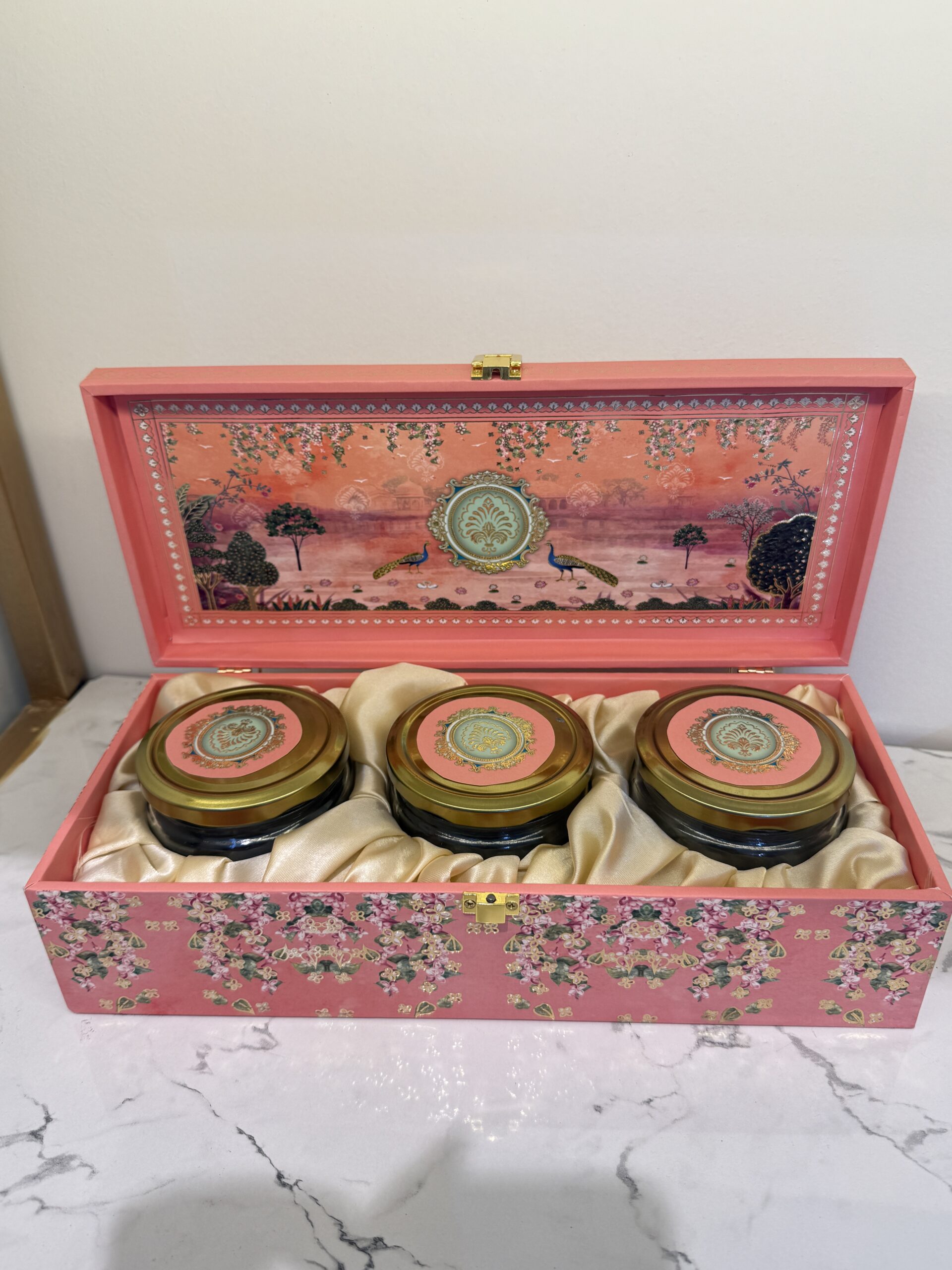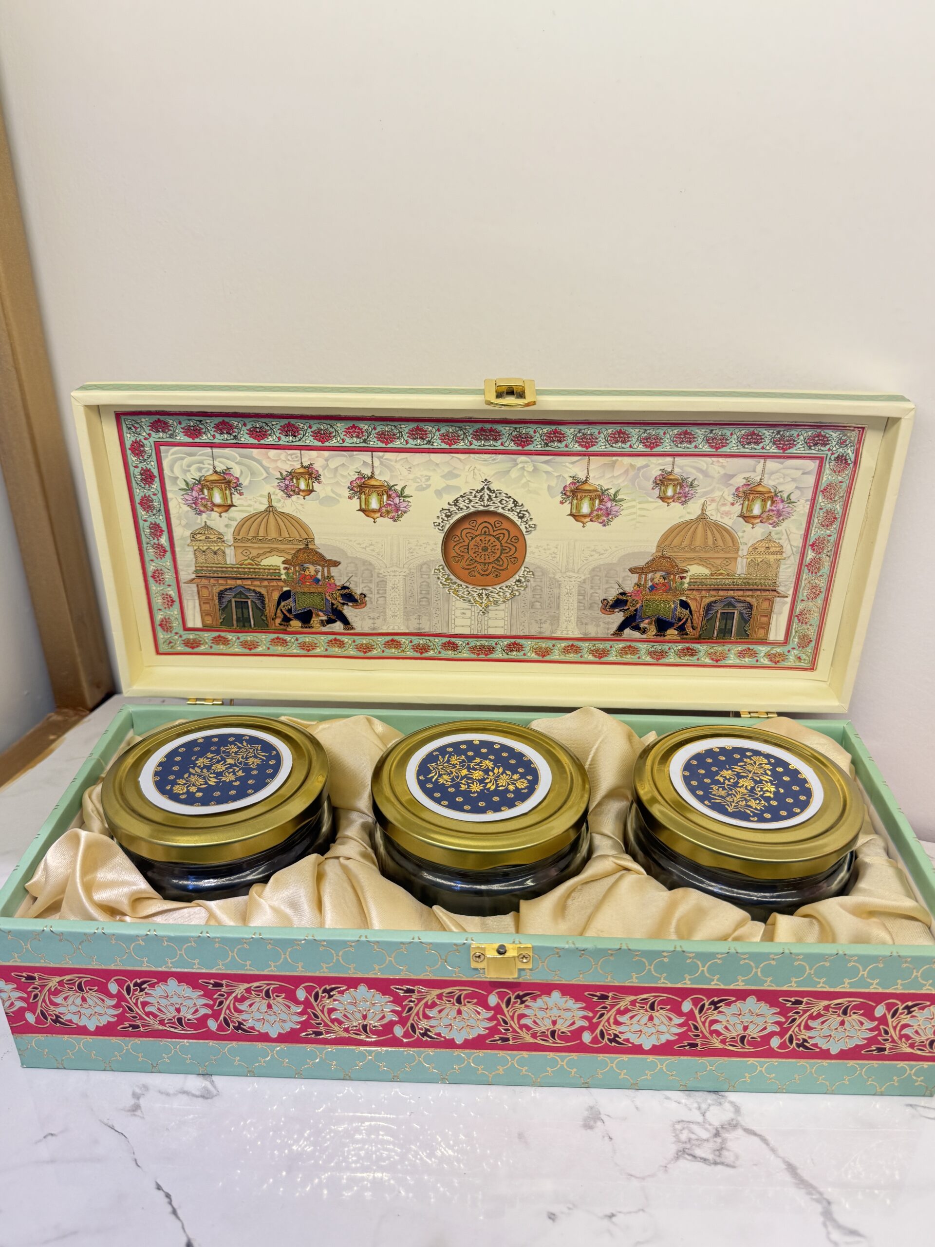 Premium MDF box, Gold foiling, latest prints with stickers on each jar, personalization available