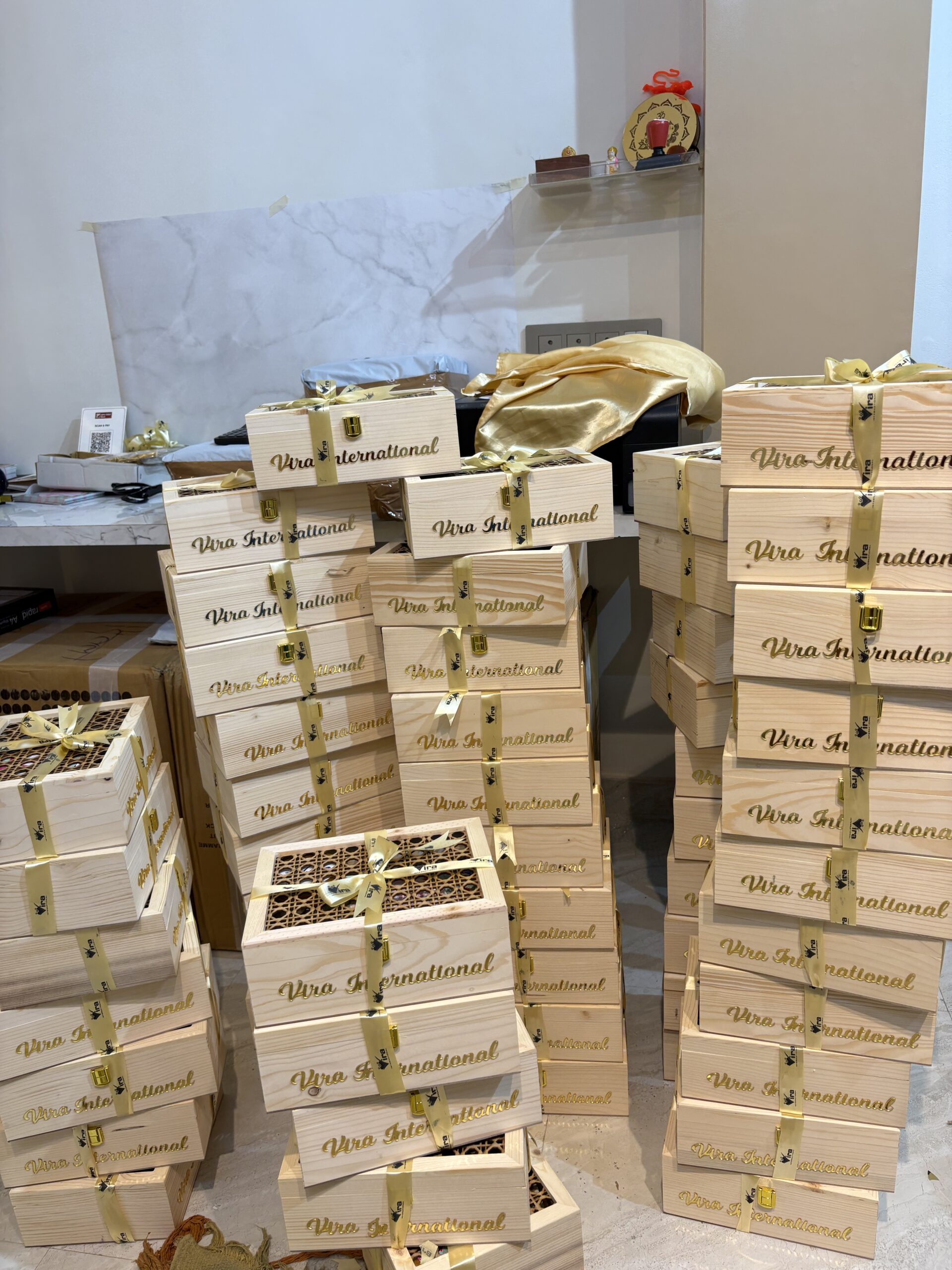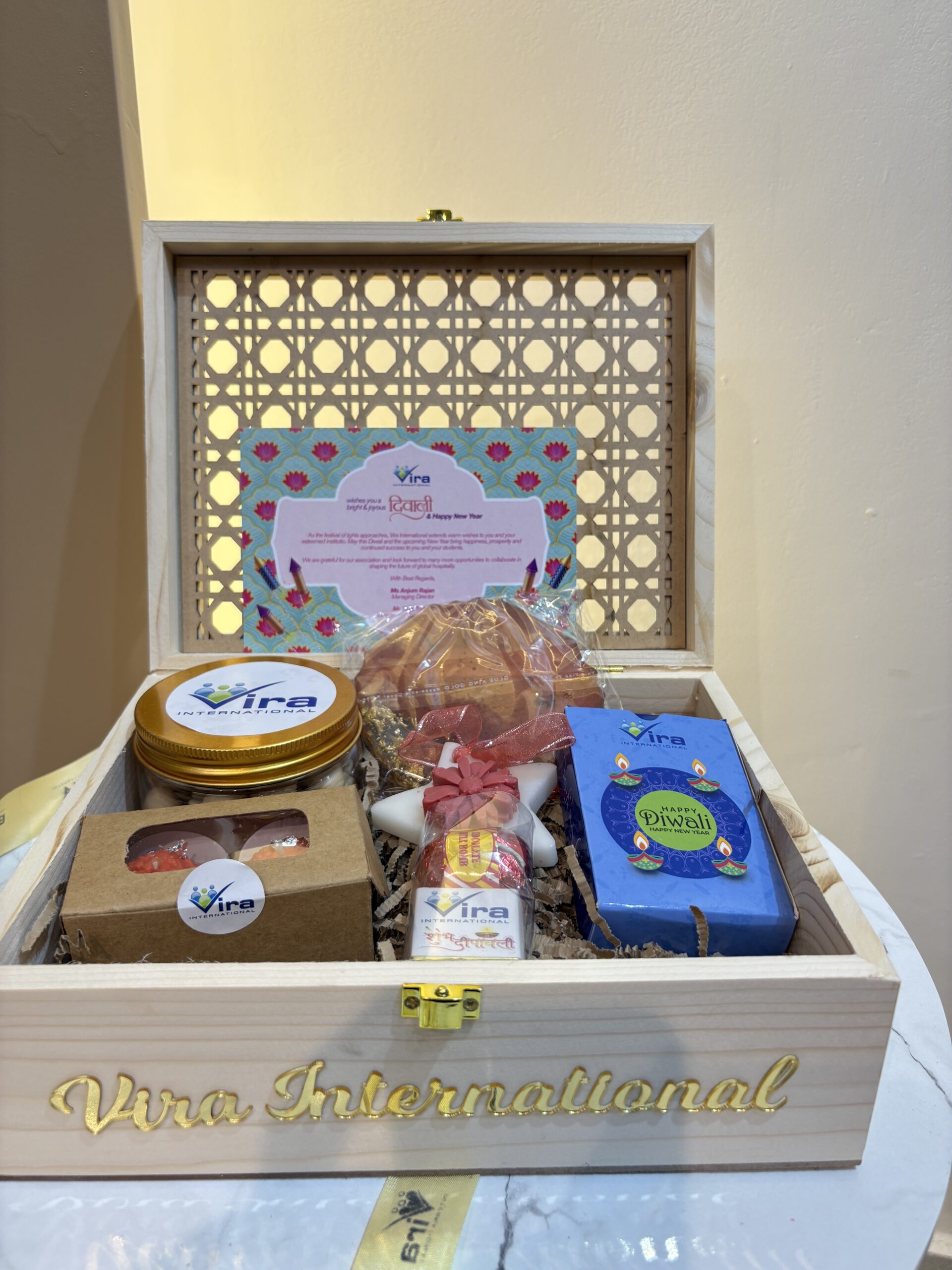 • Pinewood ratan style box 10" by 8"200gms of tiramisu almonds, Customised Chocolates, Resin coaster, Scented candle, customised card (4by6), customised ribbon, Acrylic name/logo, Playing Deck (customised)