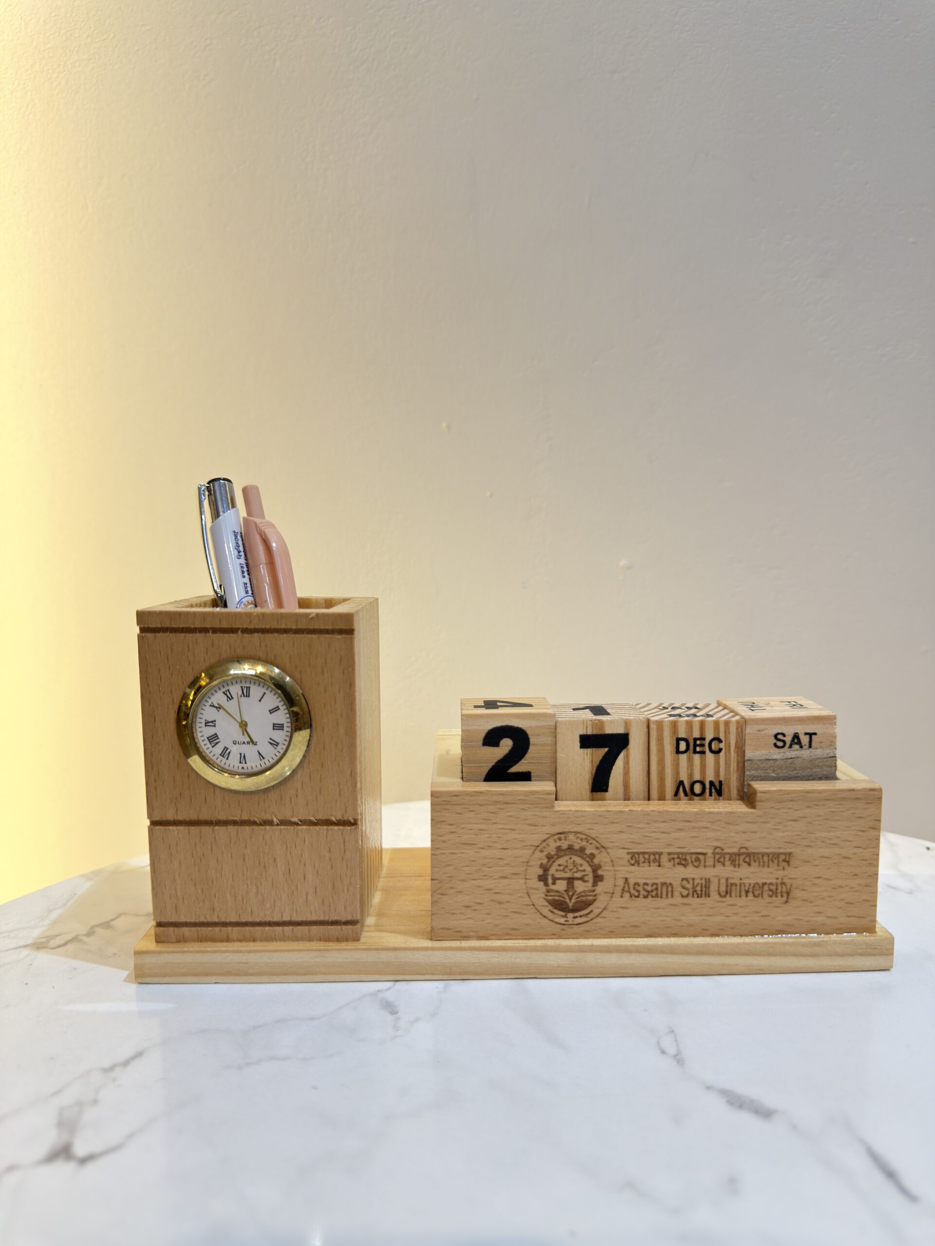 This versatile table organizer with pen stand goes beyond simple storage. It features an integrated analog watch to keep you on schedule and a sleek, flip-style calendar to track your deadlines at a glance. Whether you are looking for a corporate desk gift or a personalized home office upgrade, this compact yet spacious organizer ensures your pens, stationery, and time-management tools are always within reach. Its warm wood grain finish and durable build make it a timeless addition to any executive office or study.